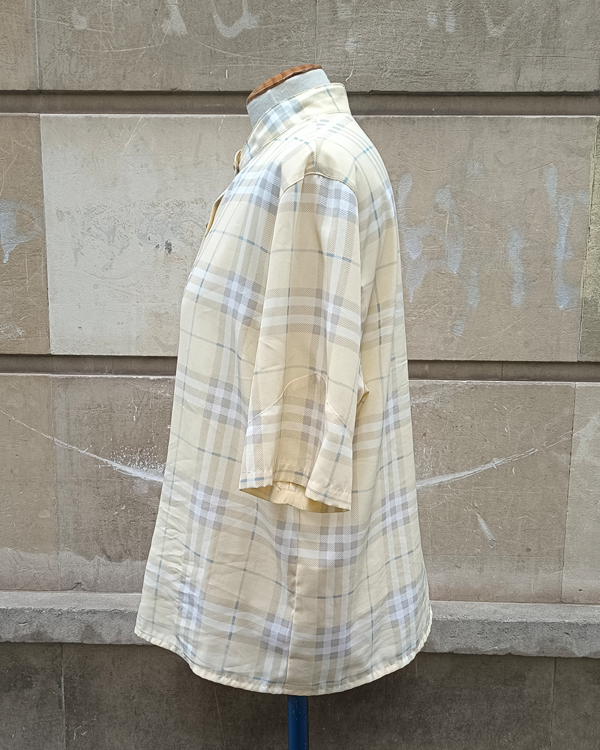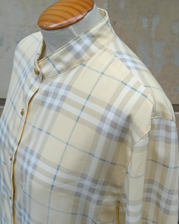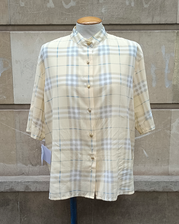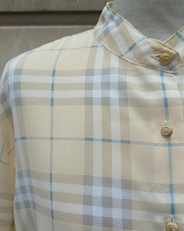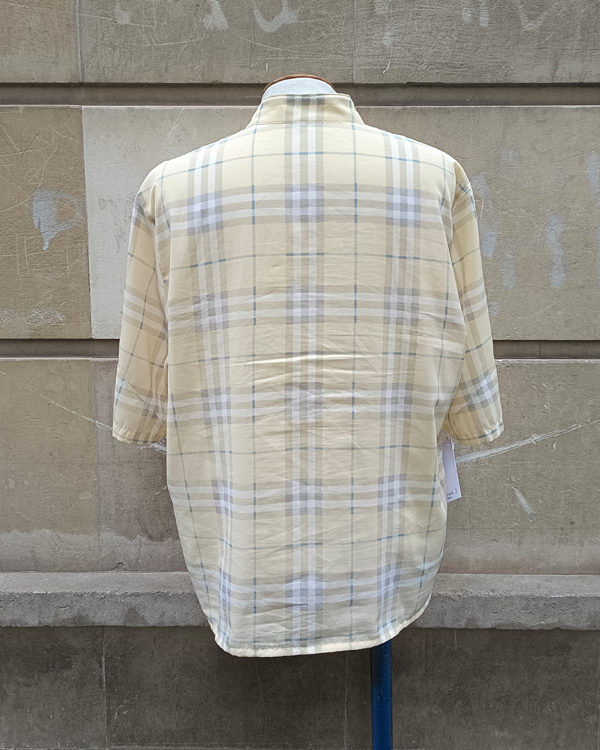 Blusa Burberry con su classic check en base amarilla. Tiene un diseño minimalista de corte oversize y cuello mao lo que le da un aire sport-lux . Nos encantan sus botones dorados con el mítico caballero de la firma en relieve. Las etiquetas de la firma han sido quitadas pero tanto el cuadro como los botones certifican su autenticidad. Tiene unas marquitas de un imperdible entre los botones y las mangas fueron modificadas en algún momento. Estas imperfecciones ya están reflejadas en el precio.