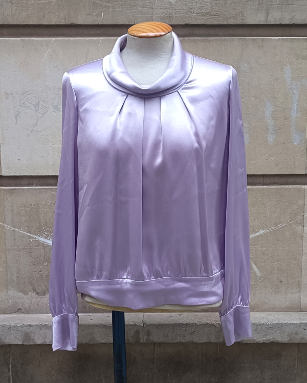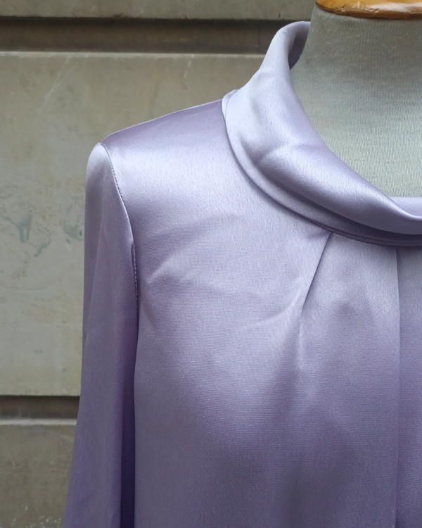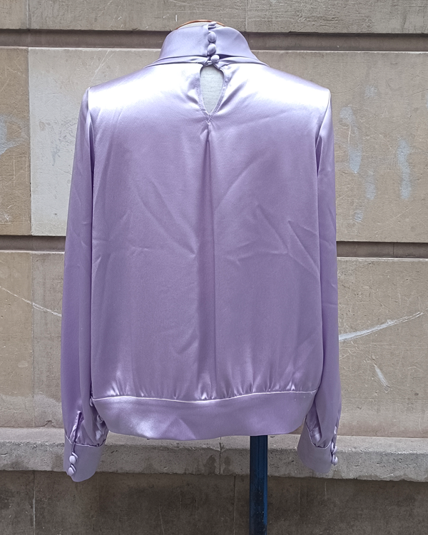 Blusa de modista, en tejido raso color lavanda y cuello vuelto. Una pieza con estilazo, que te puede servir para la oficina o para eventos.