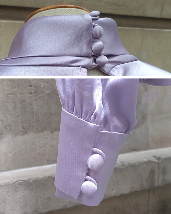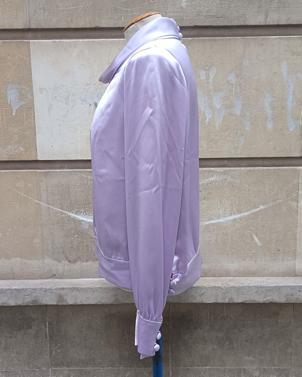 Blusa confeccionada a medida, por lo tanto es una pieza única. Su tejido de raso en color lavanda la hace muy fácil de combinar y le da cierto toque chic.