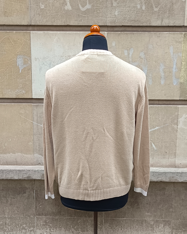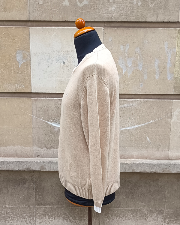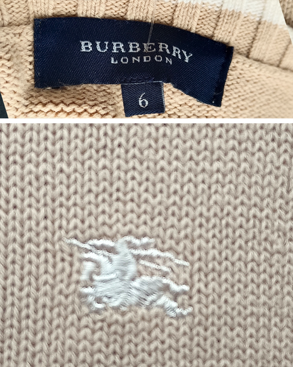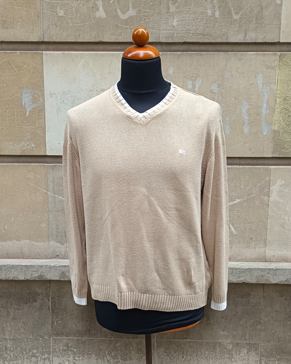 El tejido de punto de algodón hace que sea la prenda de entretiempo perfecta. El cuello de pico (V-neck) está rematado con una línea blanca que le da un aire deportivo clásico. Incluye el emblemático bordado de Burberry en el pecho, un sello de la casa británica. Su tono beige neutro permite infinitas combinaciones. Funciona tanto en un look masculino clásico como en una propuesta femenina oversize metido por dentro de unos pantalones de pinzas. Además su estado de conservación es muy bueno. No presenta deformaciones ni pérdida de color.
