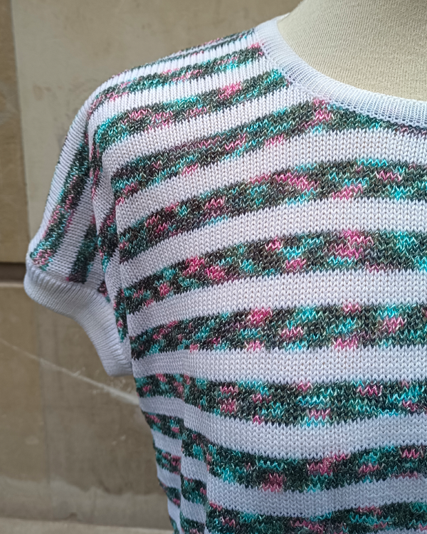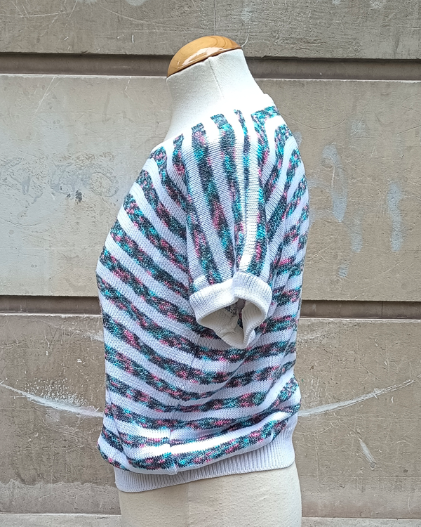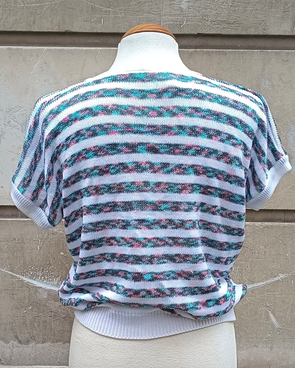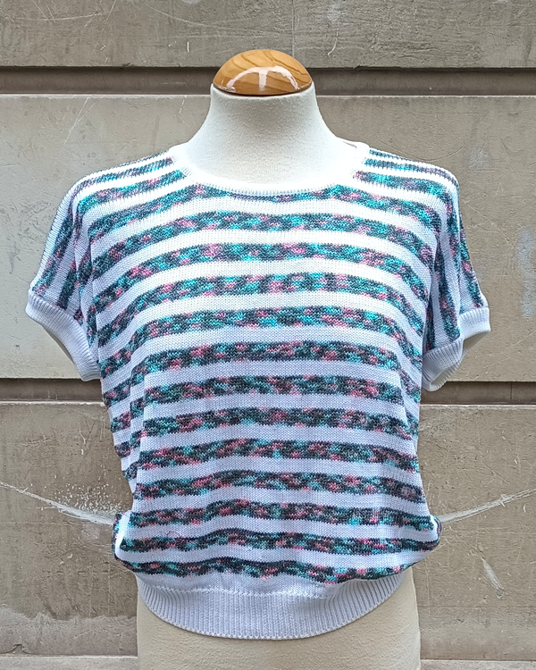 Top de punto ligero de los años 80. Una prenda divertida que captura la esencia más pop de los anos 80. Sobre una base de punto blanco, destacan sus rayas texturizadas en rosa fucsia y turquesa neón, creando un efecto brillante. Con su cuello redondo y manga corta, es el básico definitivo para elevar cualquier look sport.