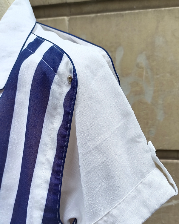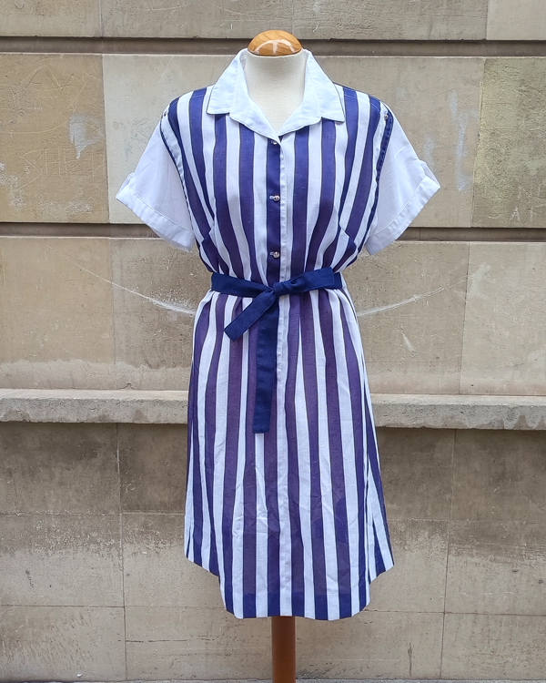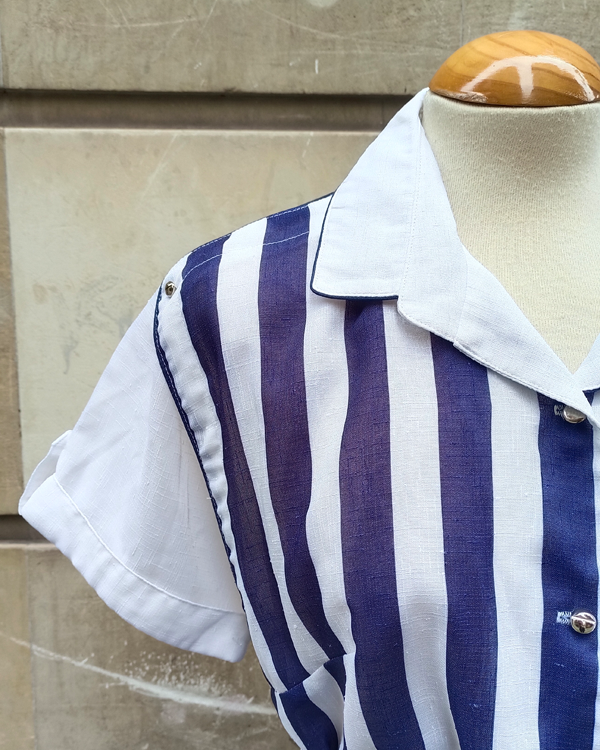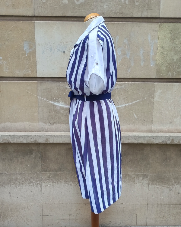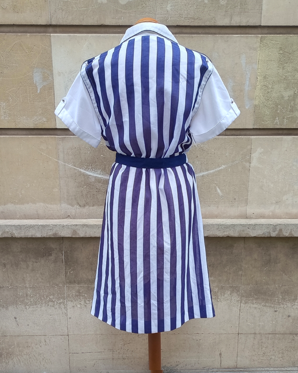 Vestido camisero de finales de los 70 y principios de los 80 de estética marinera. Tejido de rayas verticales en azul marino y blanco, complementado con un cuello camisero clásico y botones metalizados. Su diseño incluye mangas de corte amplio con vuelta y un cinturón de lazo a juego que puedes ajusta a tu gusto.