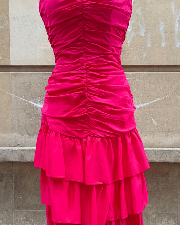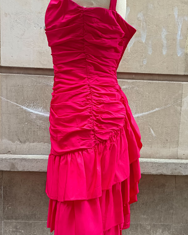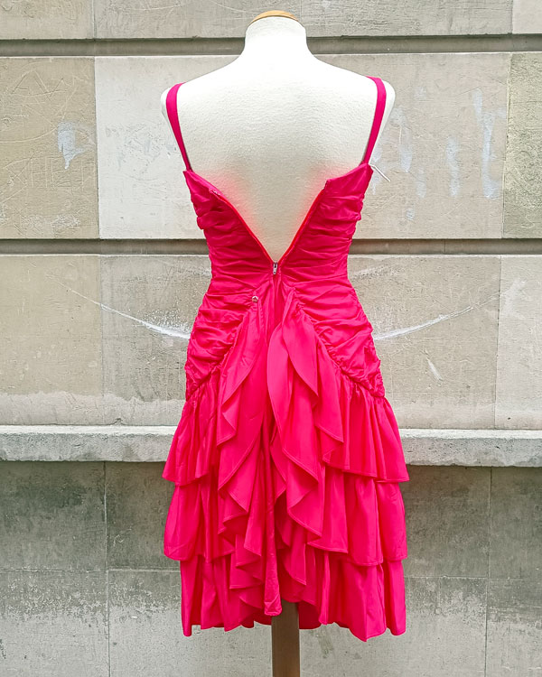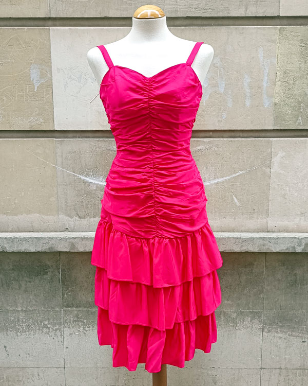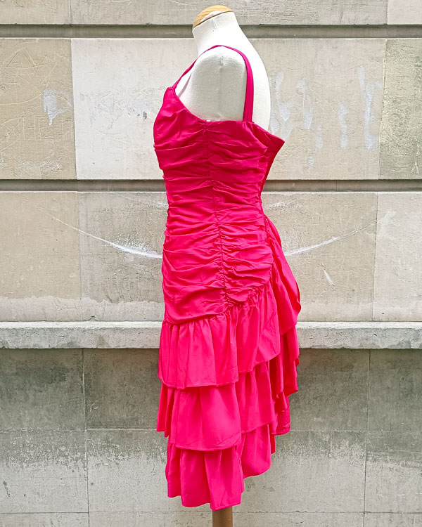 Espectacular vestido de cóctel 60s color fresa. De corte vistoso: el diseño de los volantes y sus frunces, hacen que sea digno de una alfombra roja. Desde luego si quieres un vestido de fiesta especial éste lo es. Como detalle curioso decirte que es de origen canadiense.