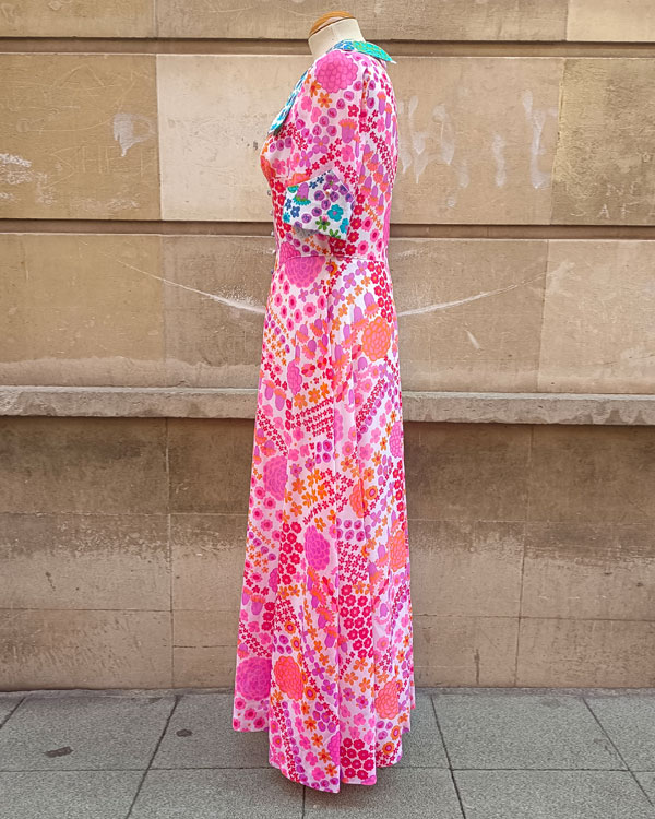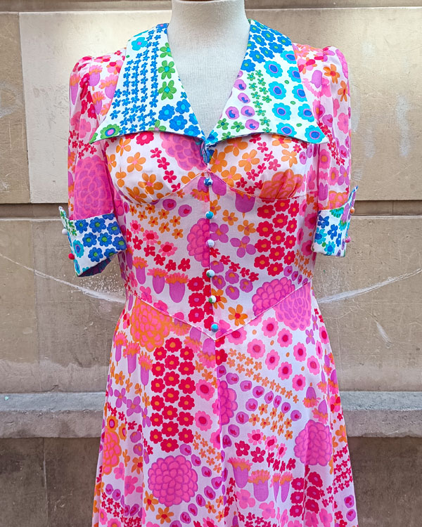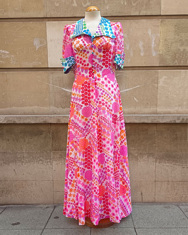 Precioso vestido de los años 60 con un estampado de flores característico de la época en colores vibrantes. Una joyita vintage.