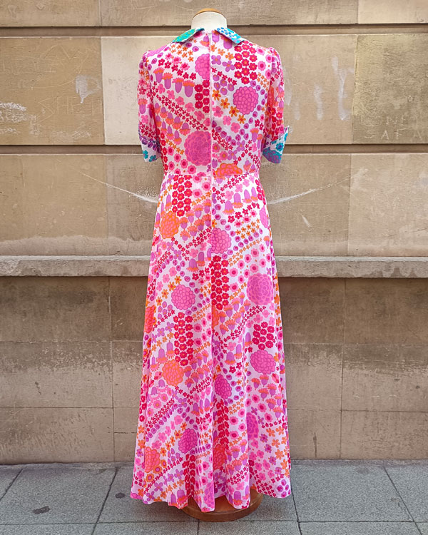 Precioso vestido de los años 60 con un estampado de flores característico de la época, es muy especial como contrastan el cuello y los puños de las mangas, su patronaje y los detalles están muy cuidados.