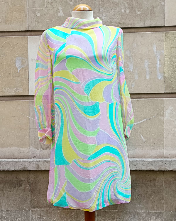 Vestido Mod original de los años 60 en seda, con estampado psicodélico en tonos pastel. Un icono pop de la era del Swinging London.