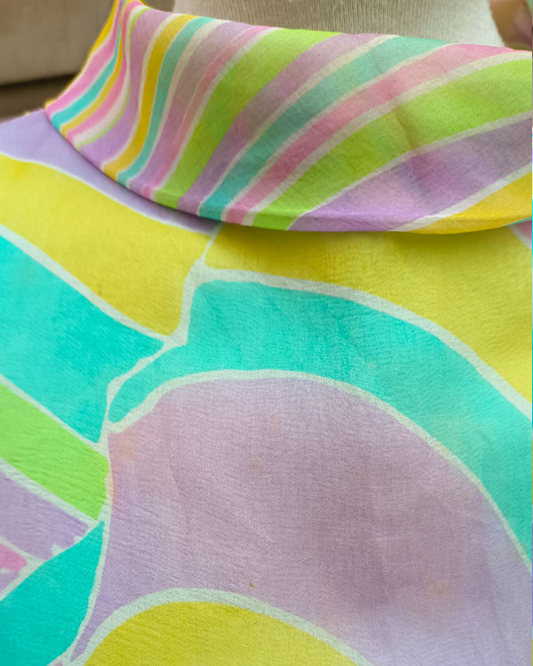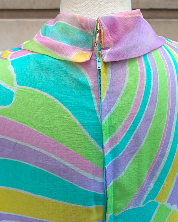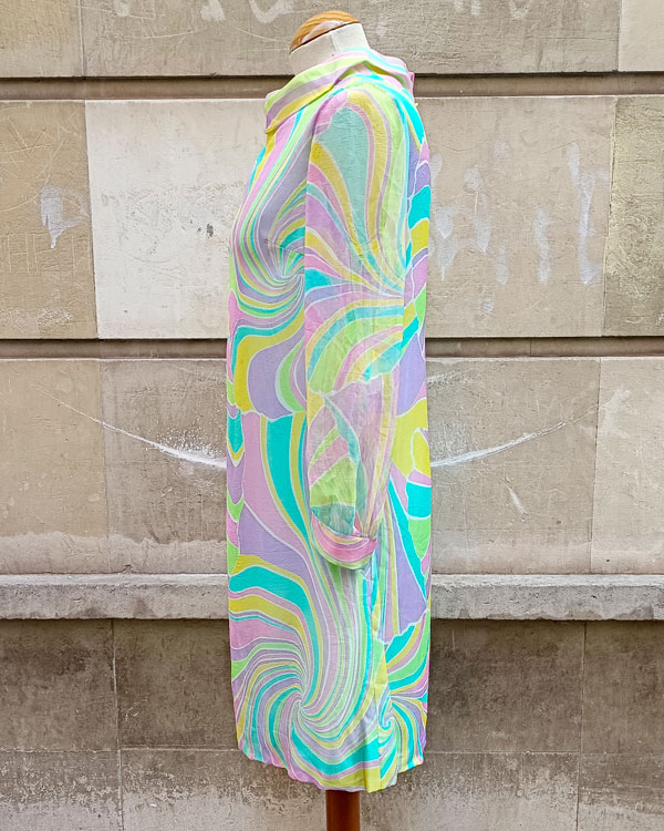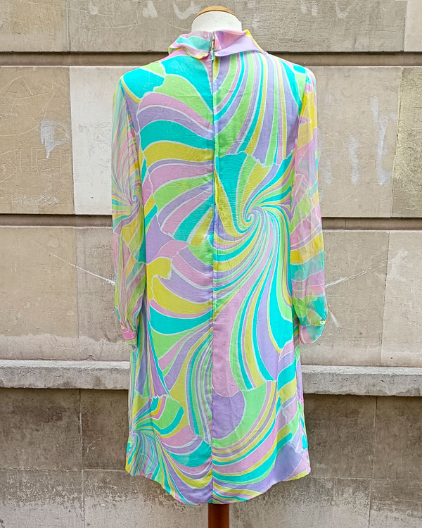 Este vestido Mod de los años 60 es una auténtica cápsula del tiempo. Confeccionado en seda ligera, presenta un hipnótico estampado psicodélico en tonos pastel: verde menta, lila, rosa y amarillo limón, que se entrelazan en curvas y espirales que evocan la era psicodélica.